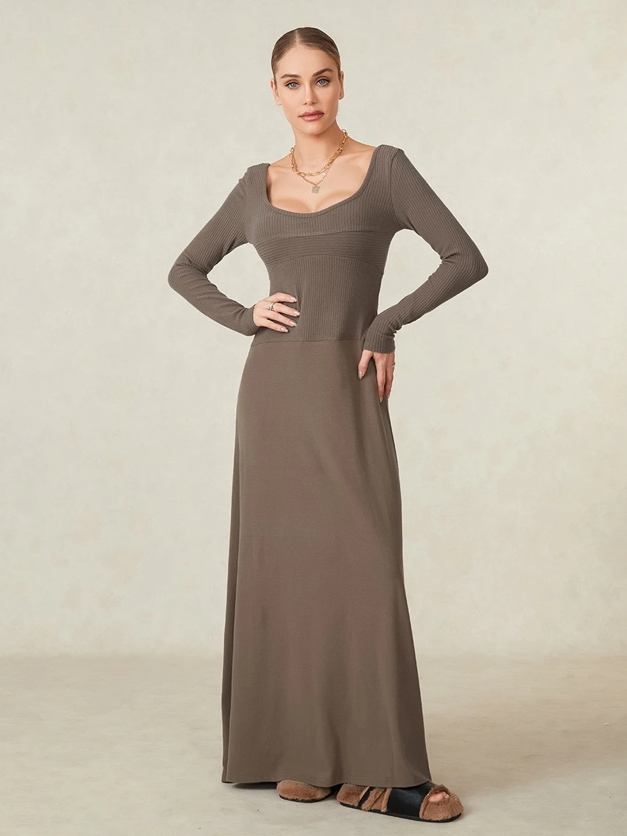 Sexy Women Fall Casual Long Dress Solid Color Square Neck Long Sleeve Knit Dress Fashion Holiday Dress