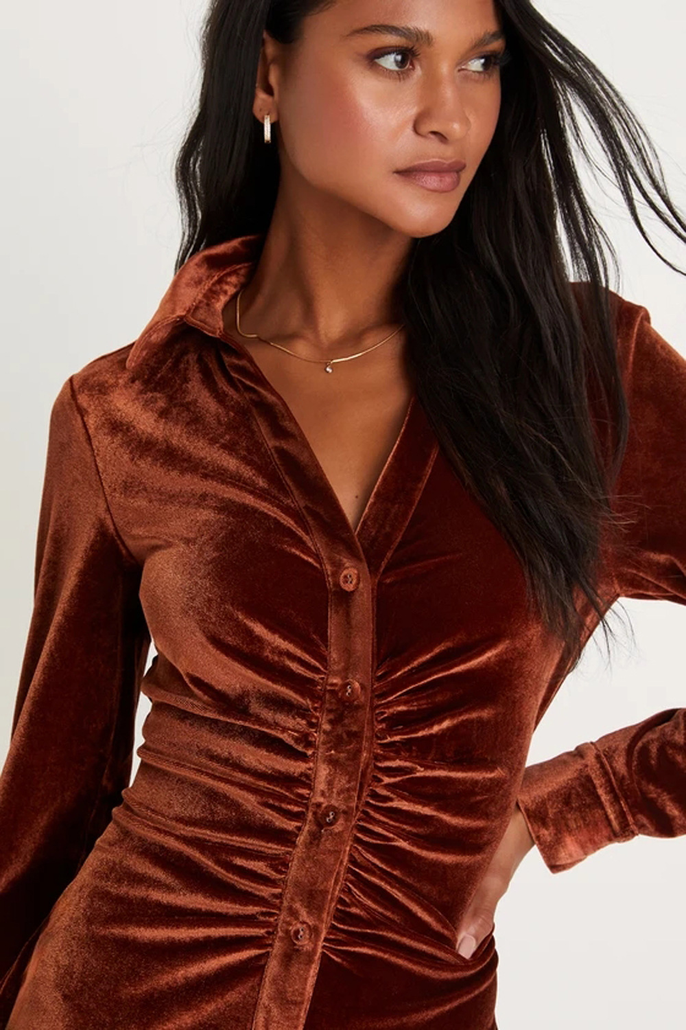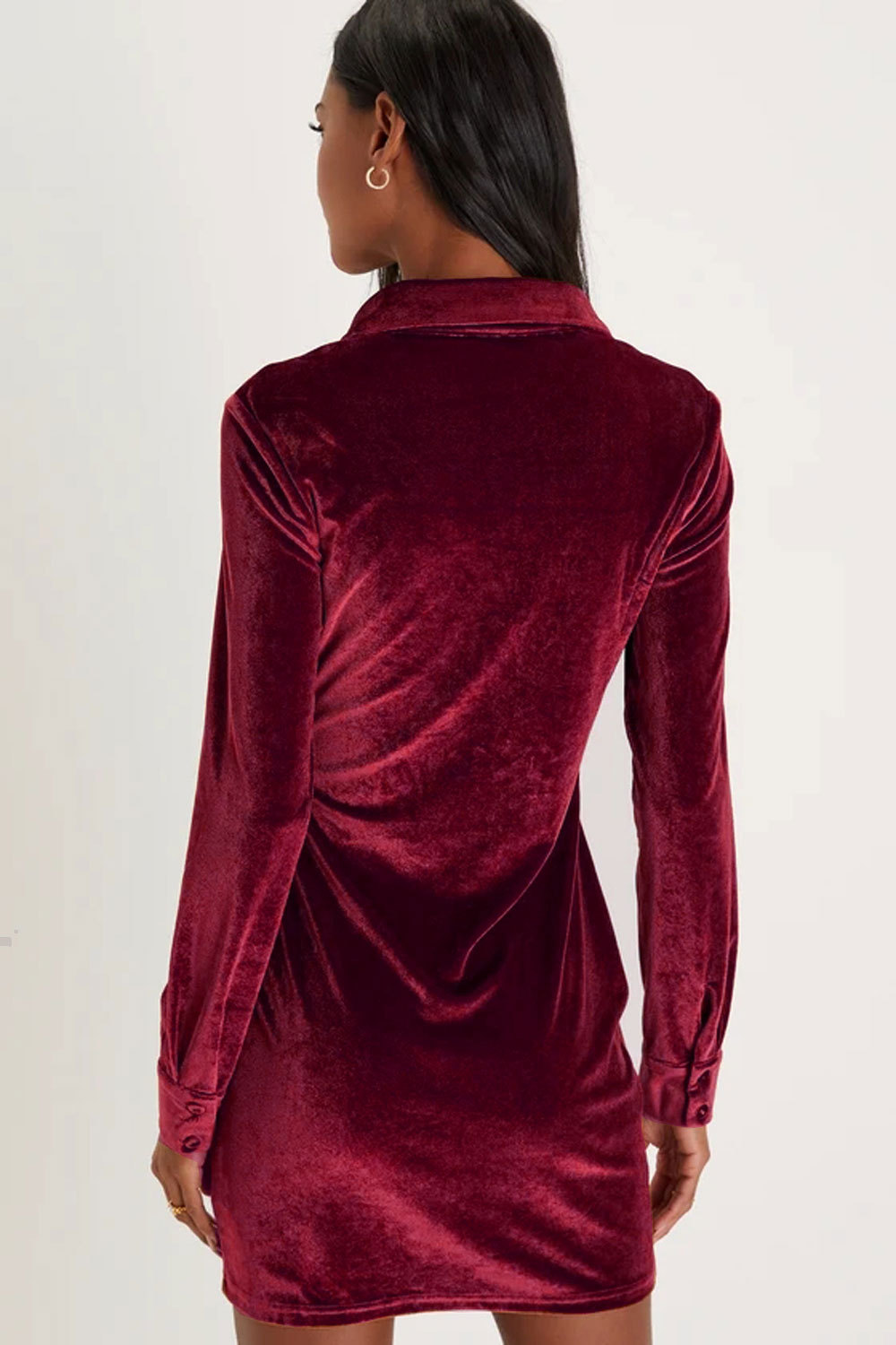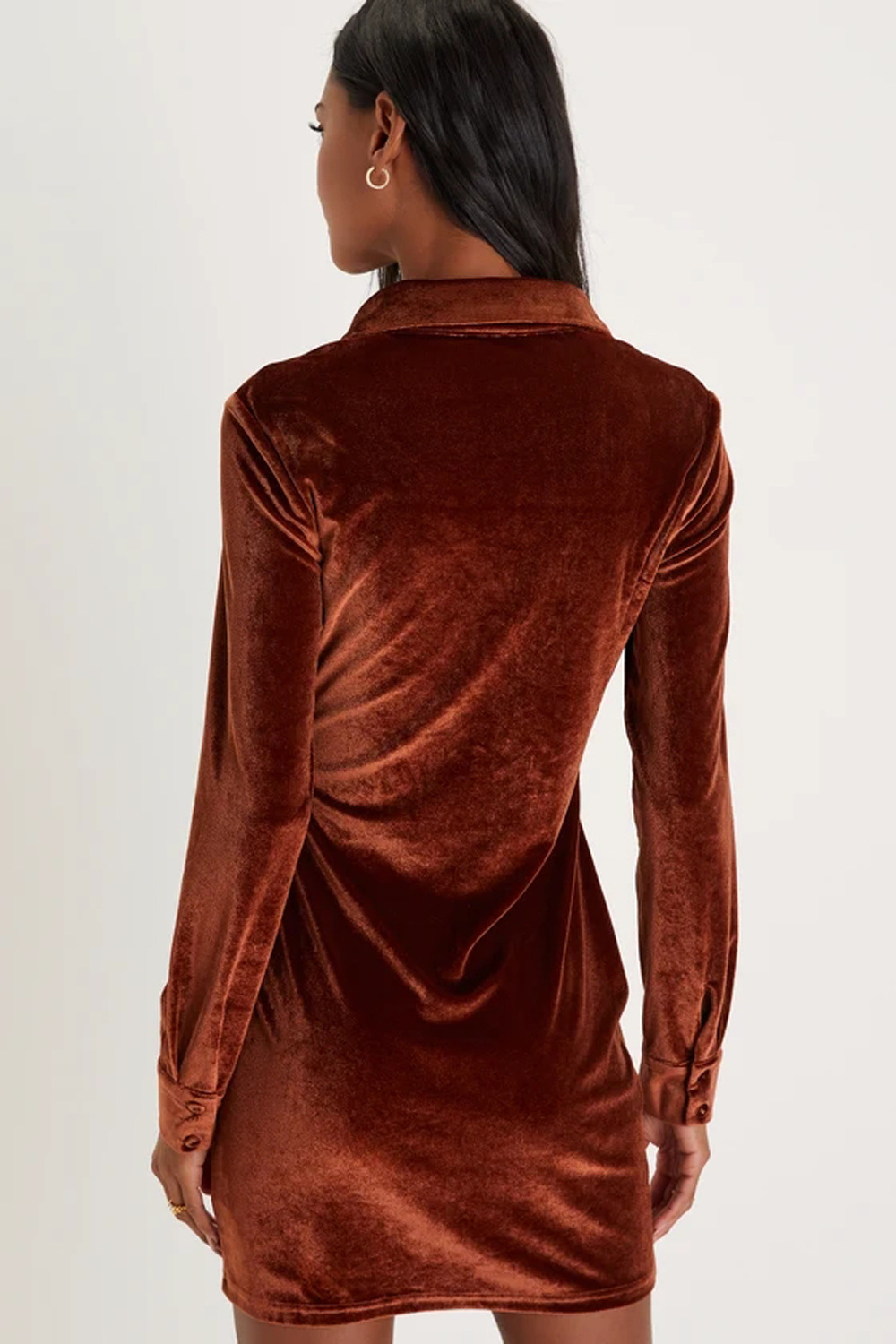 Women Clothing Velvet Shirt Women Long Sleeved Single Breasted Small Pleated Waist Tight Shirt Sheath Dress