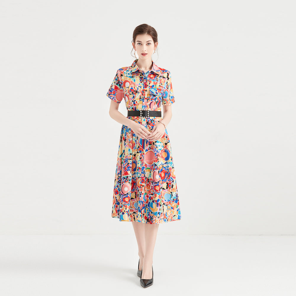 Women Spring Summer and Autumn New Lapel Half placket Color Letter V Short sleeved Dress Women Elegant Mid length Dress with Loosening Waist