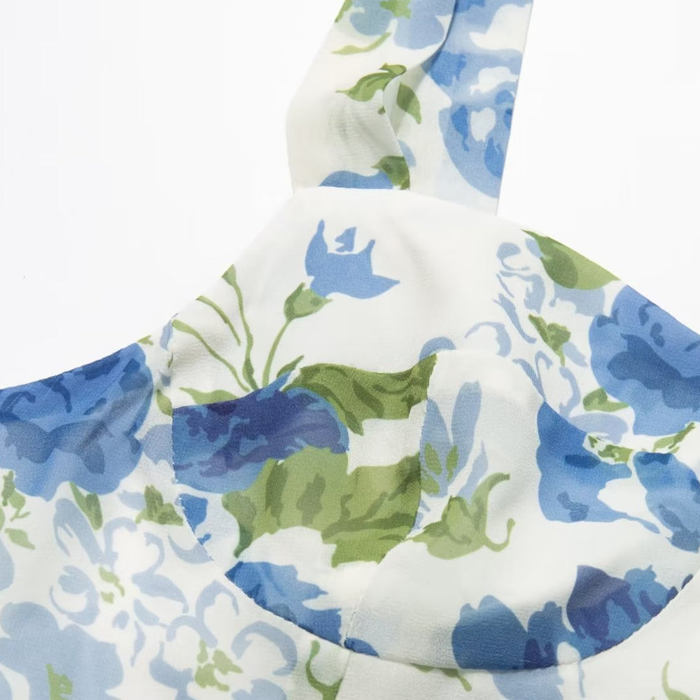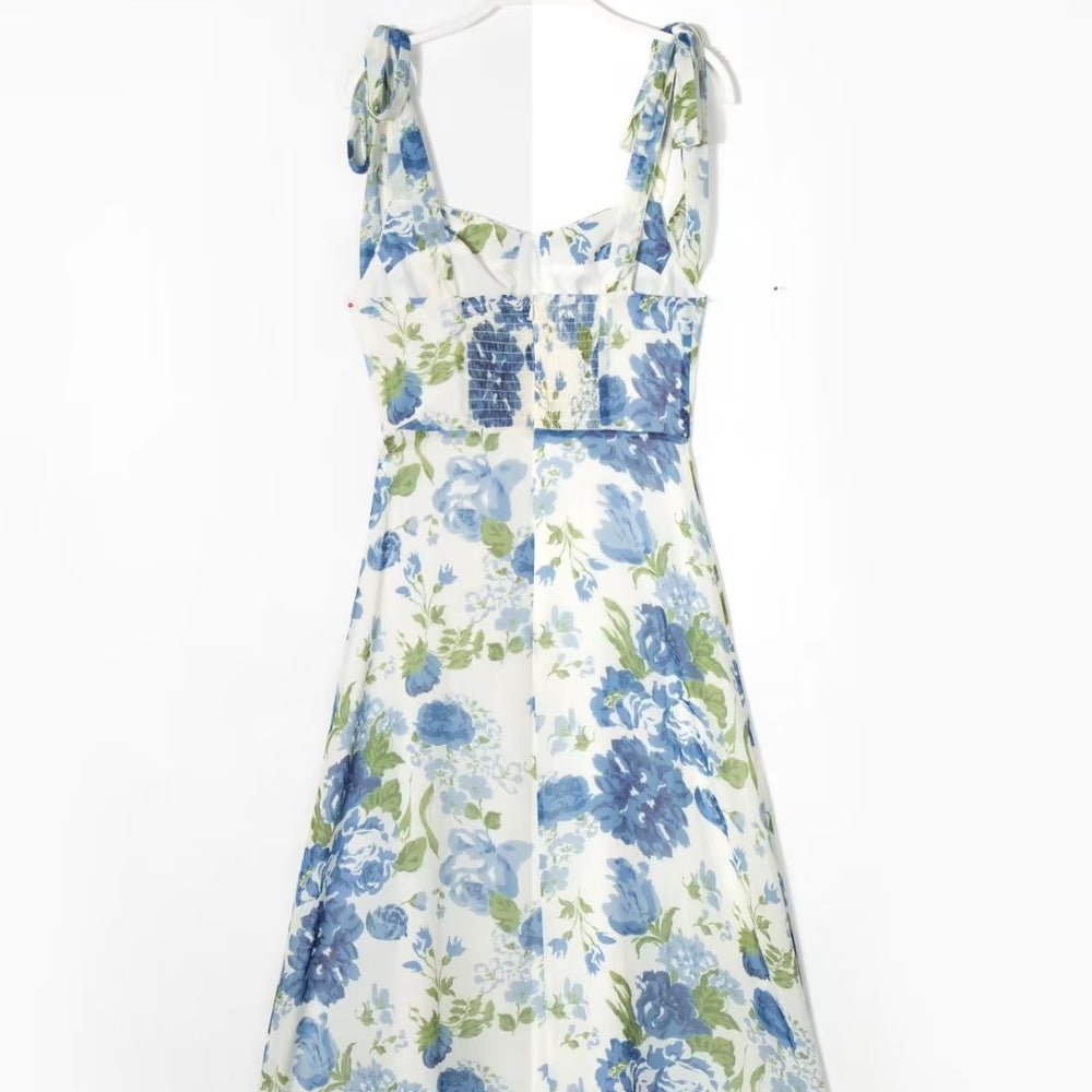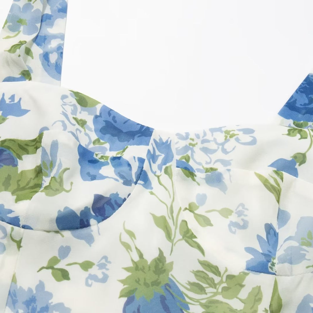Spring Summer Women Clothing Maxi Dress High Waist Strap Type Drawstring Printed Dress