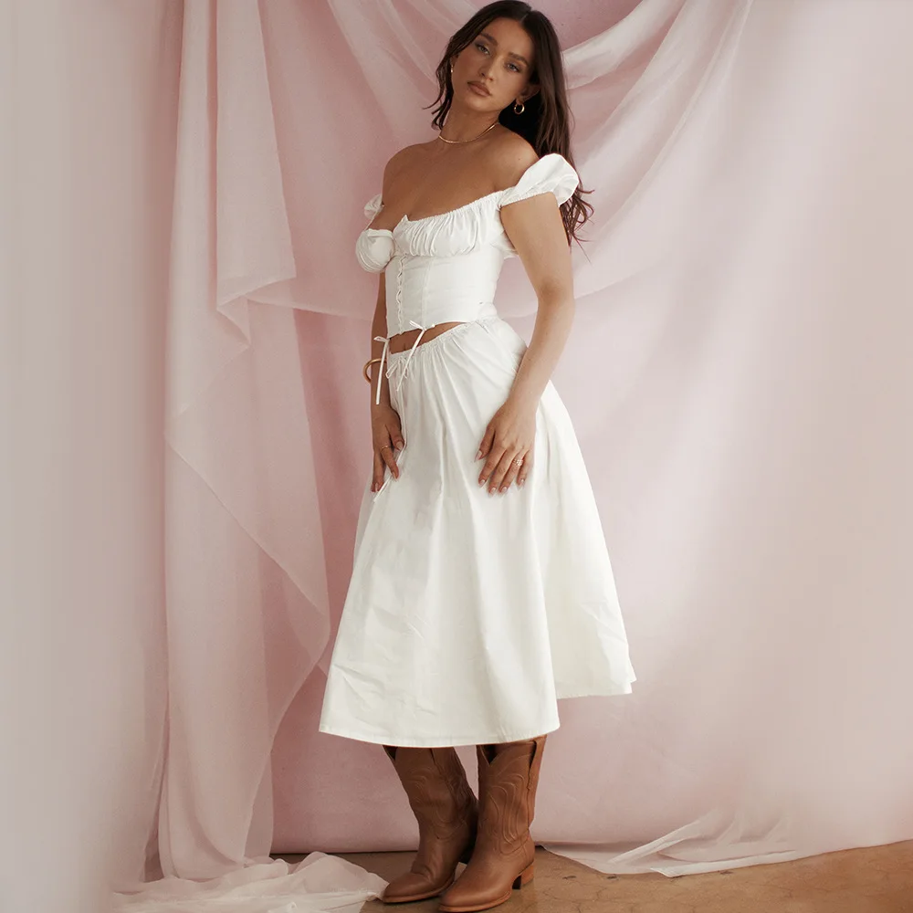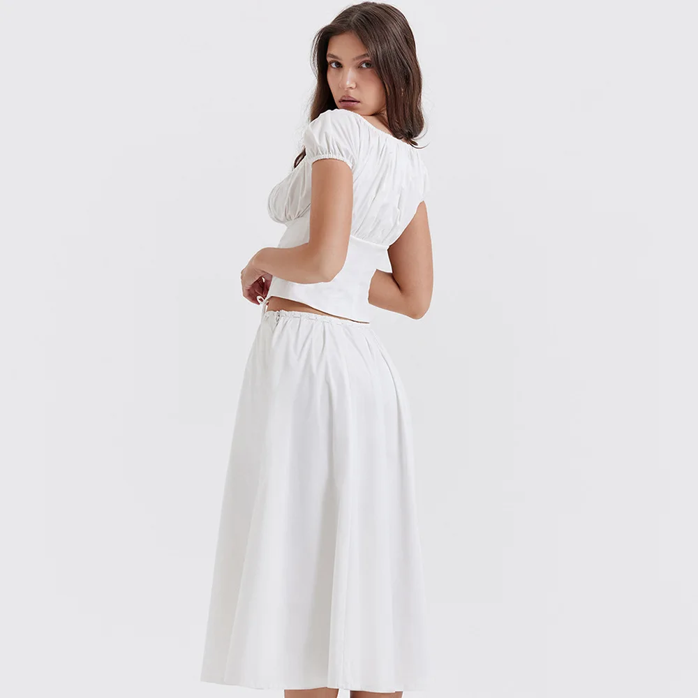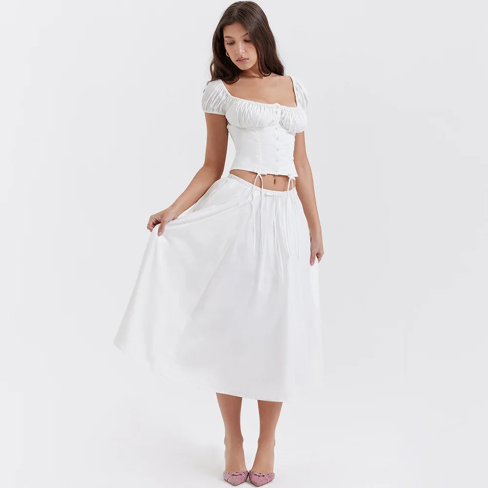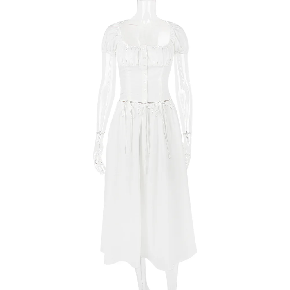 Drawstring Top And Skirt Set 2023 Women's Sexy Solid Color Puff Short-sleeved Square Neck Top And Skirt Two-piece Set