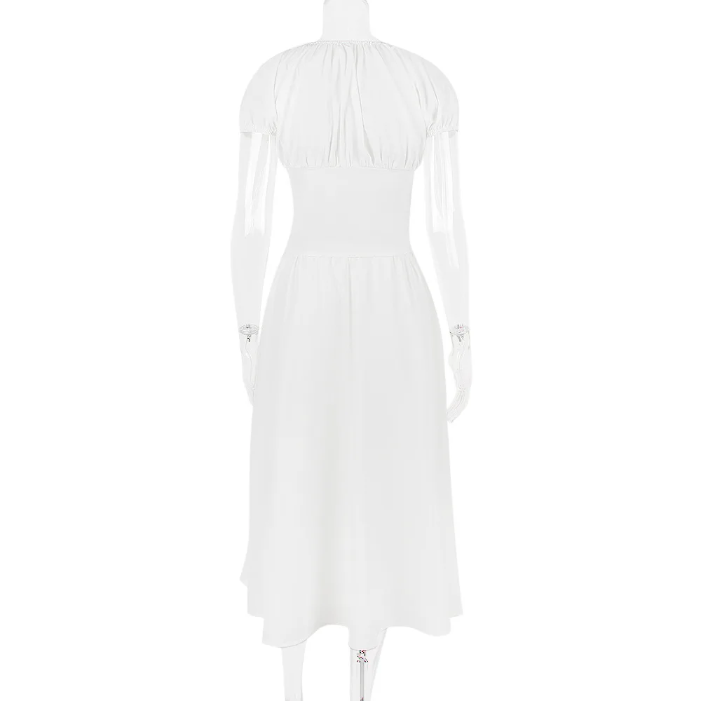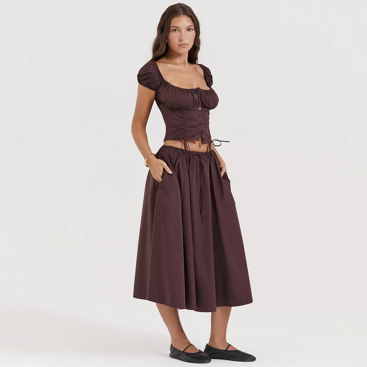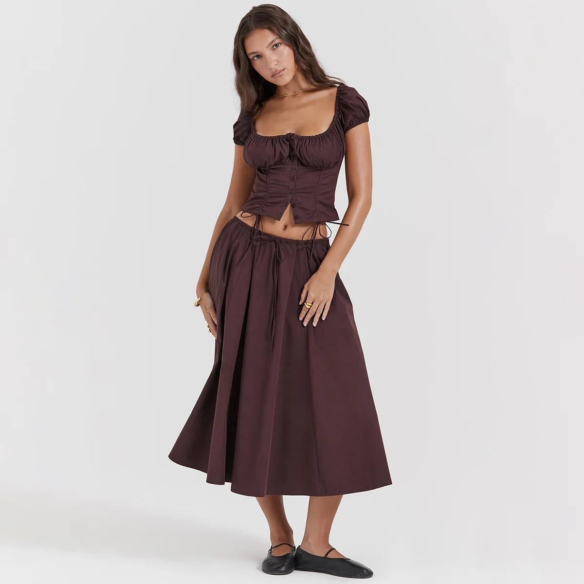 Drawstring Top And Skirt Set 2023 Women's Sexy Solid Color Puff Short-sleeved Square Neck Top And Skirt Two-piece Set