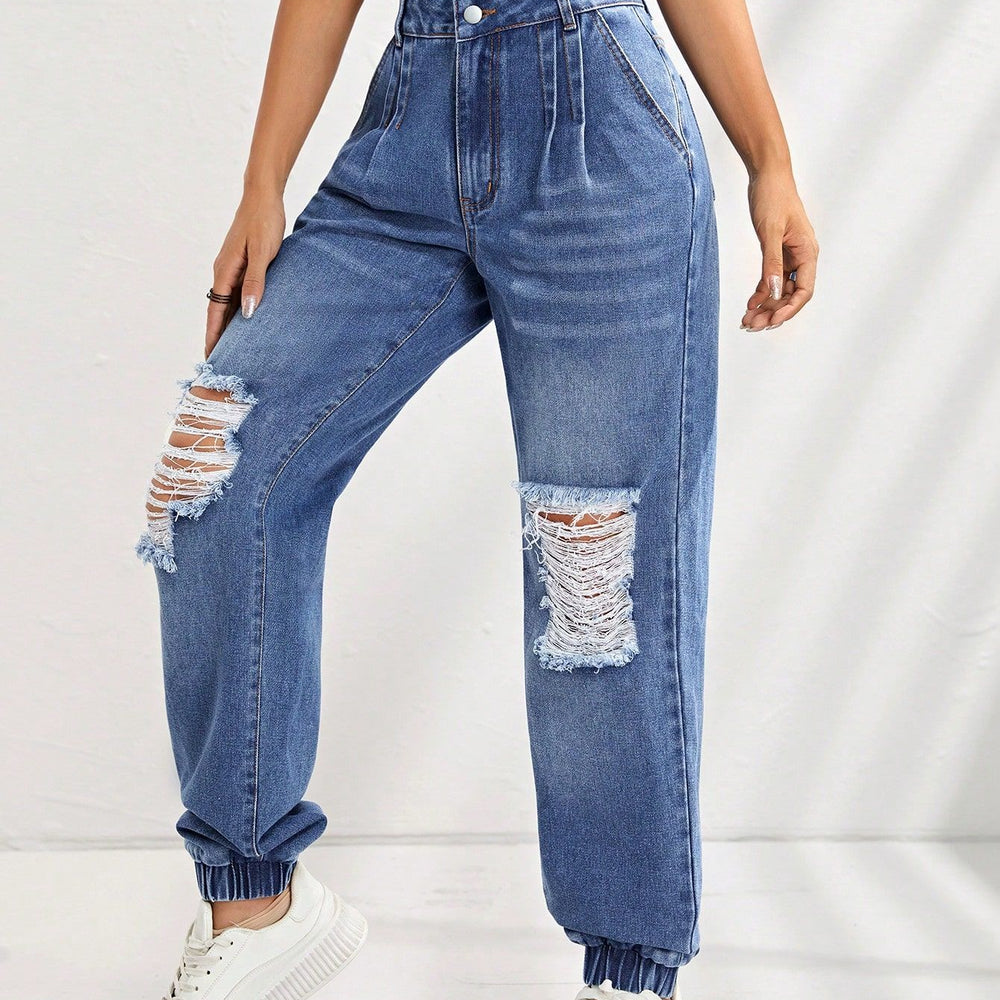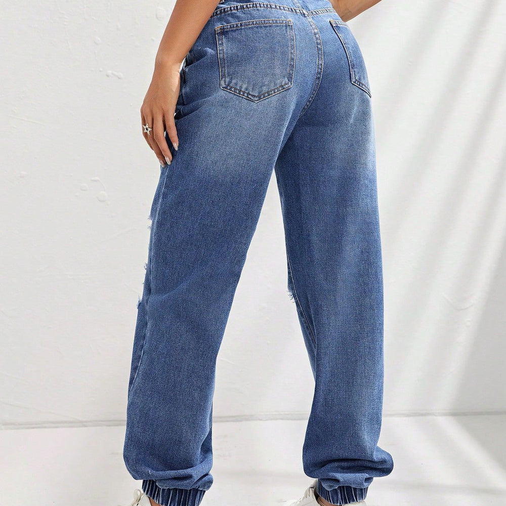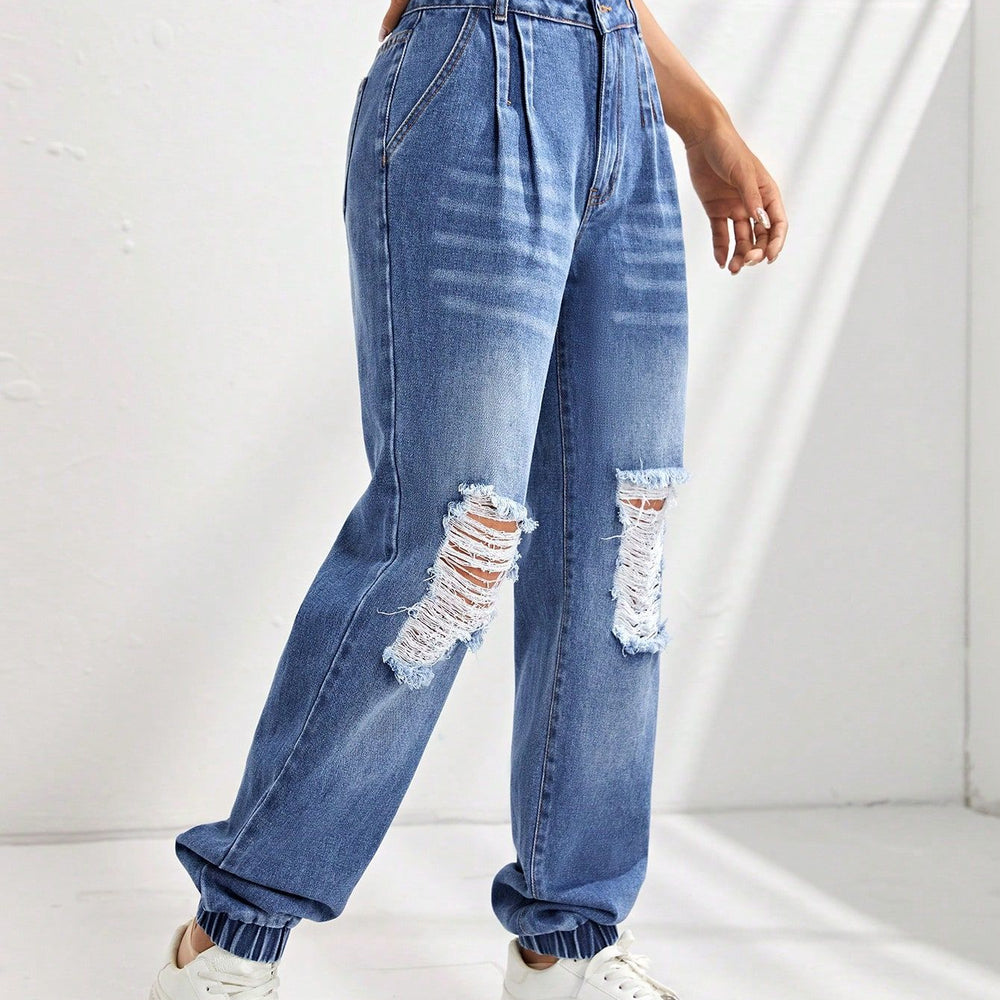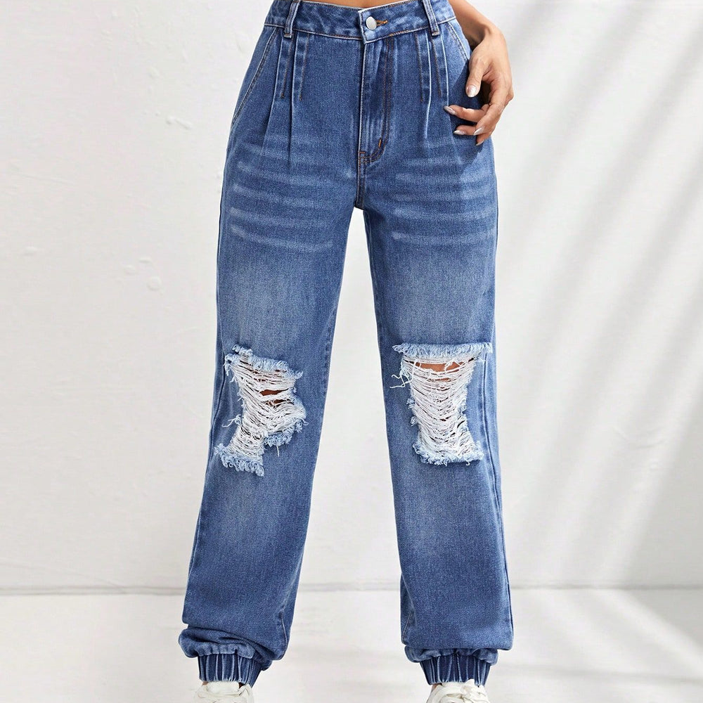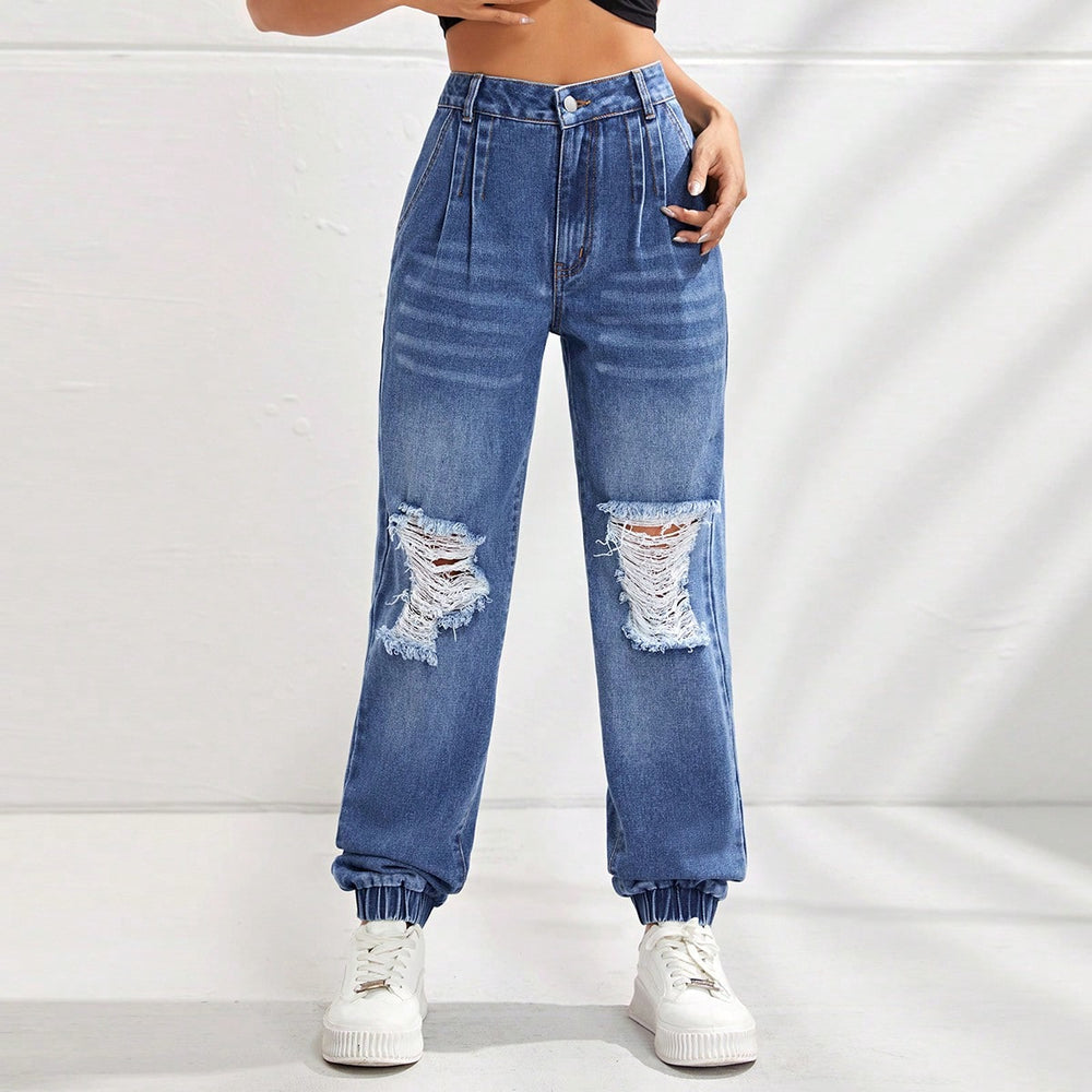 Women Clothing High Waist Slimming Holes Ankle Tied Jeans