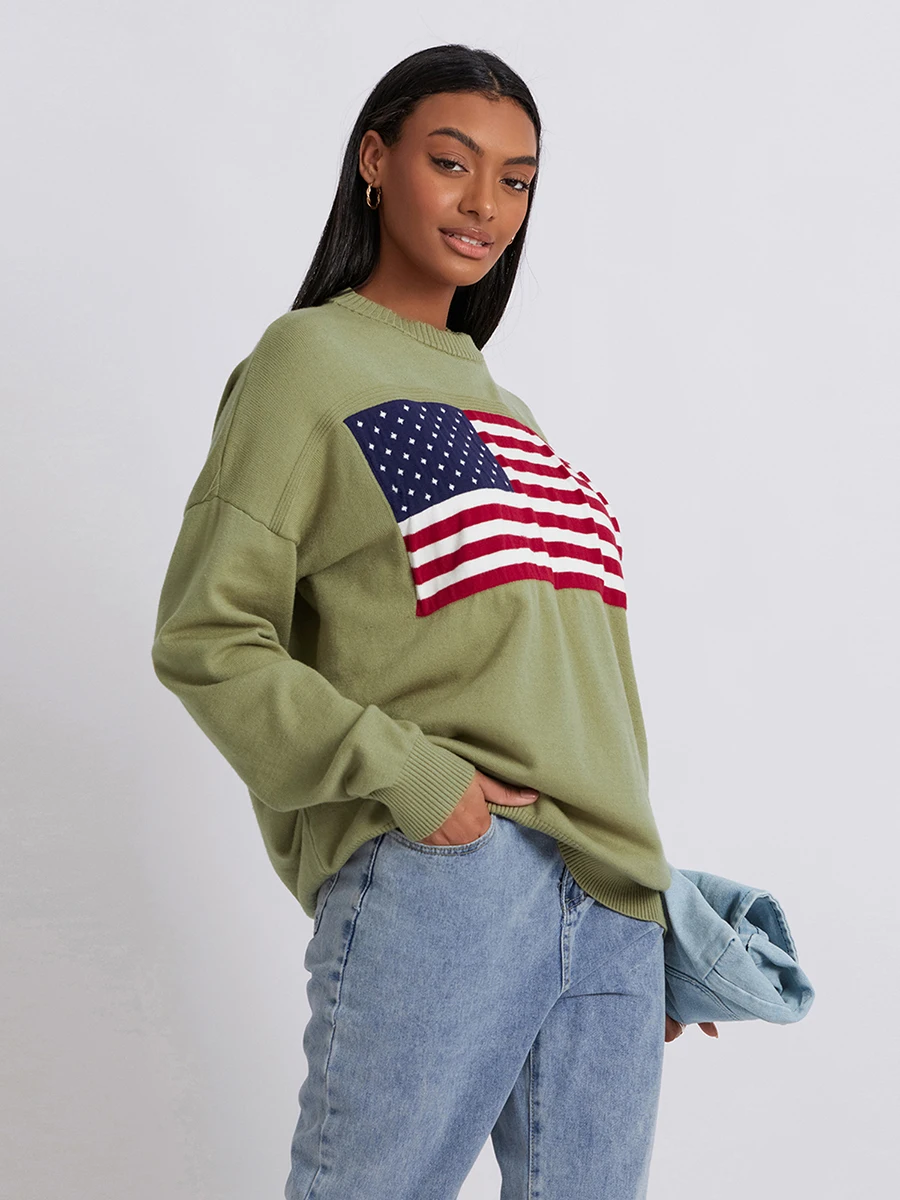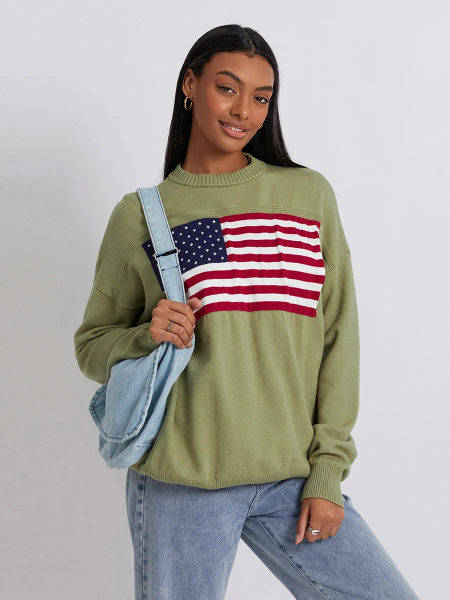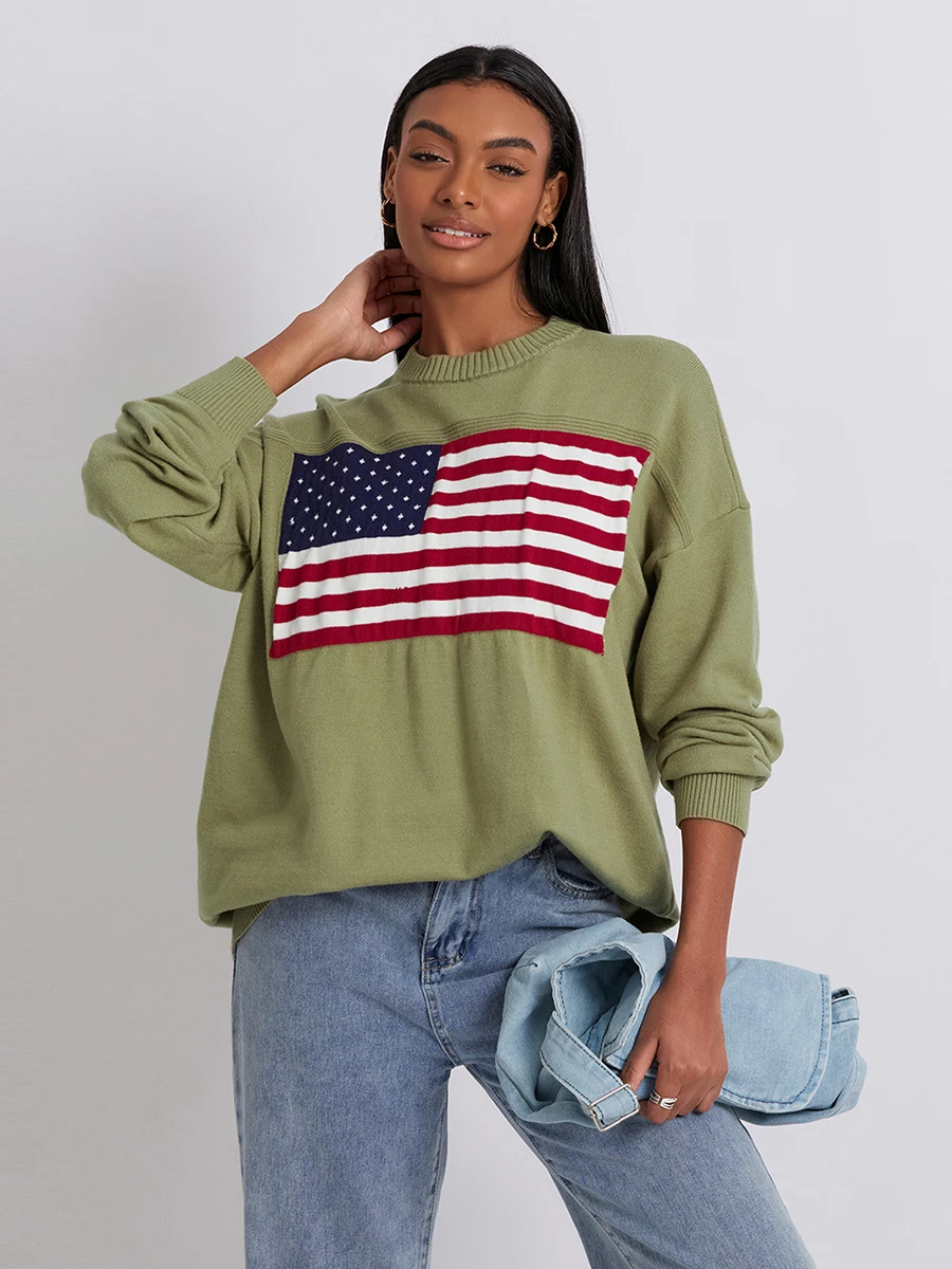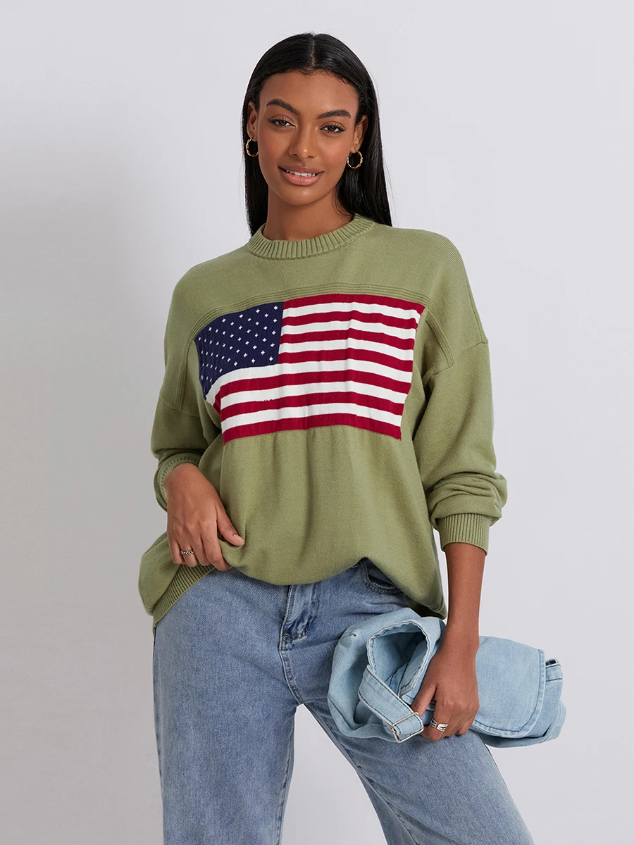 Women s Flag Pattern Long Sleeve Round Neck Sweater Casual Loose Pullover Sweater