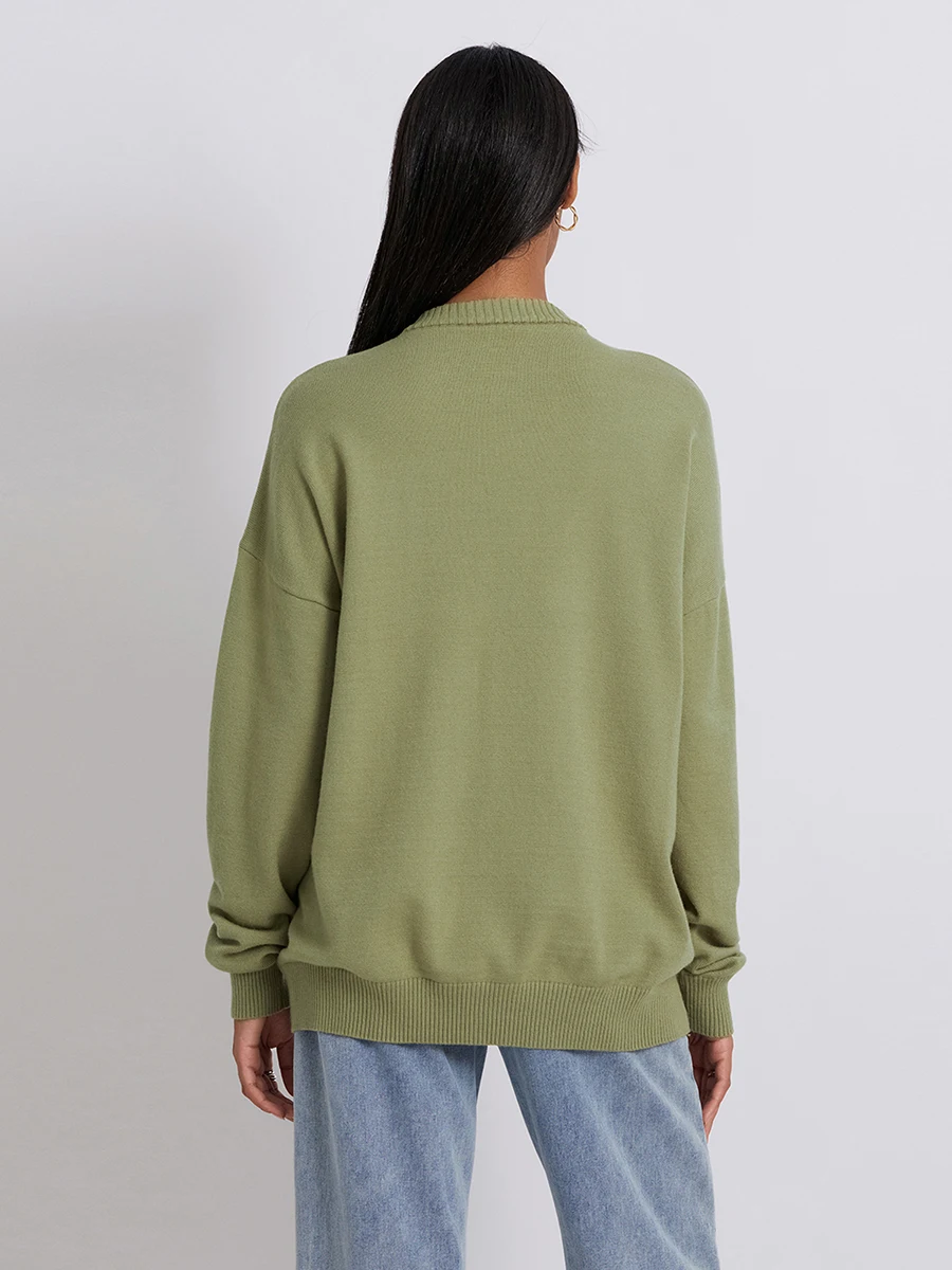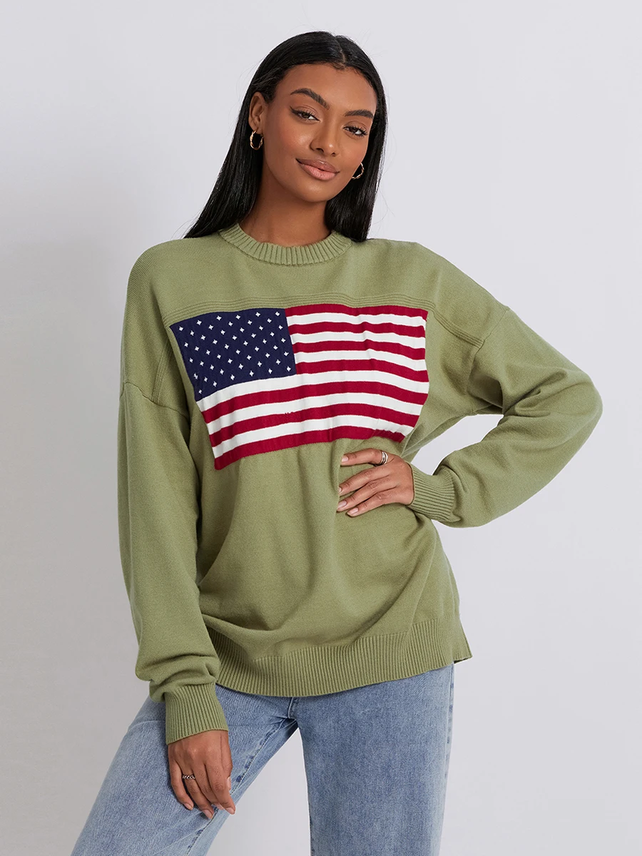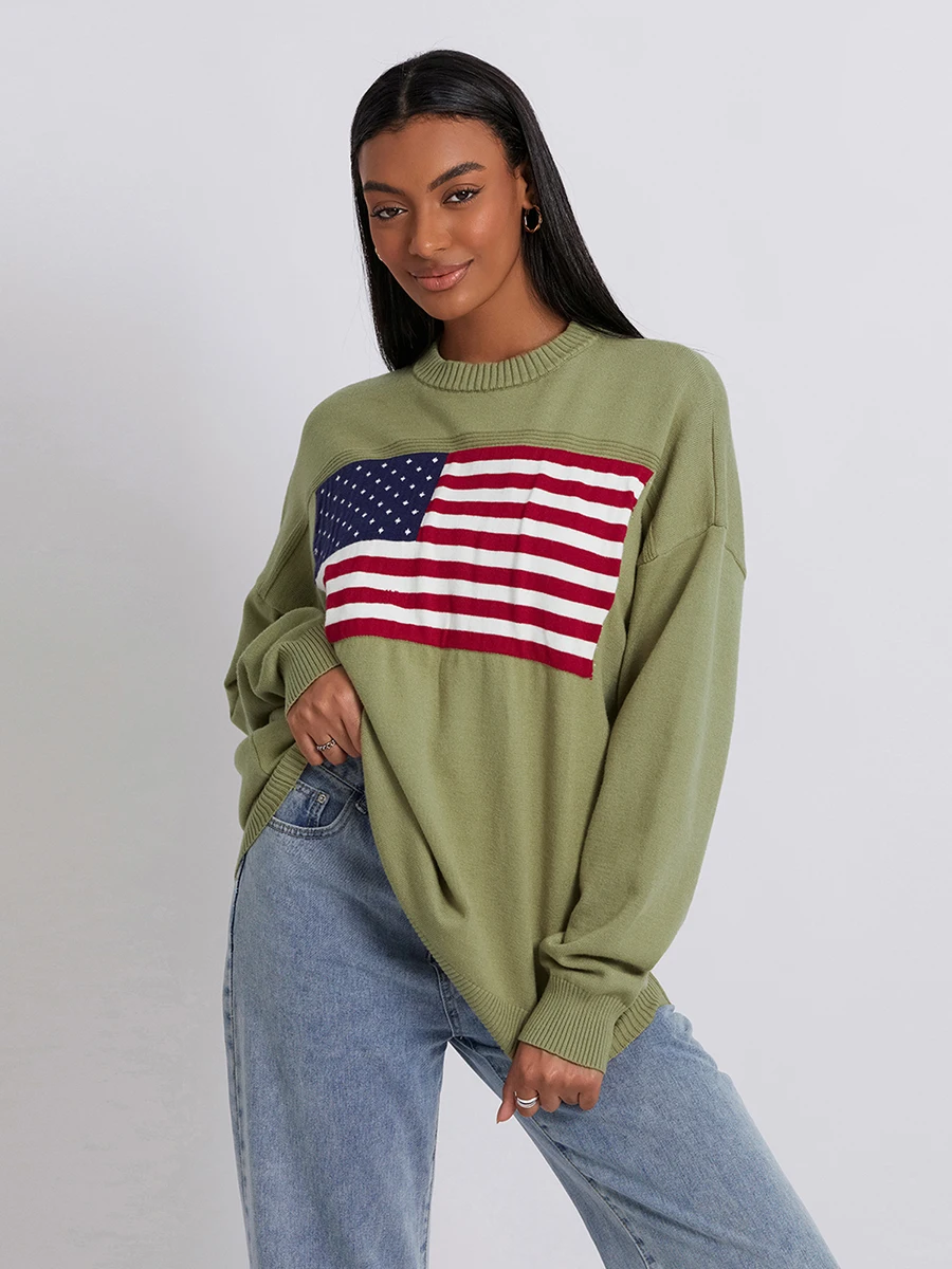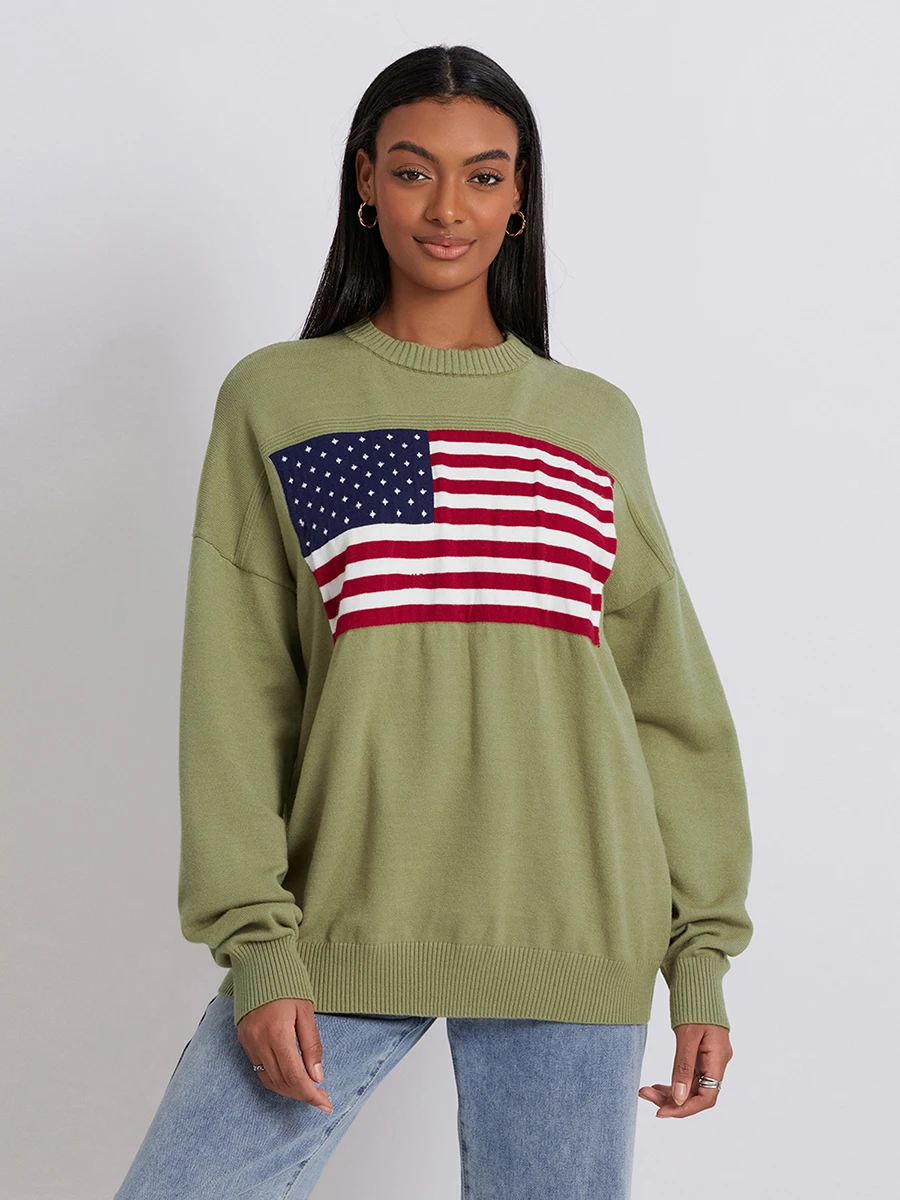 Women s Flag Pattern Long Sleeve Round Neck Sweater Casual Loose Pullover Sweater