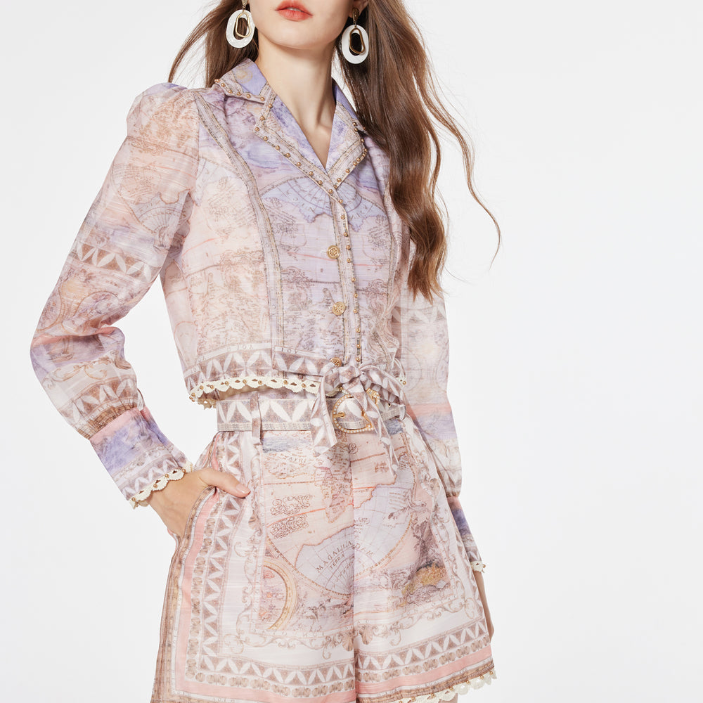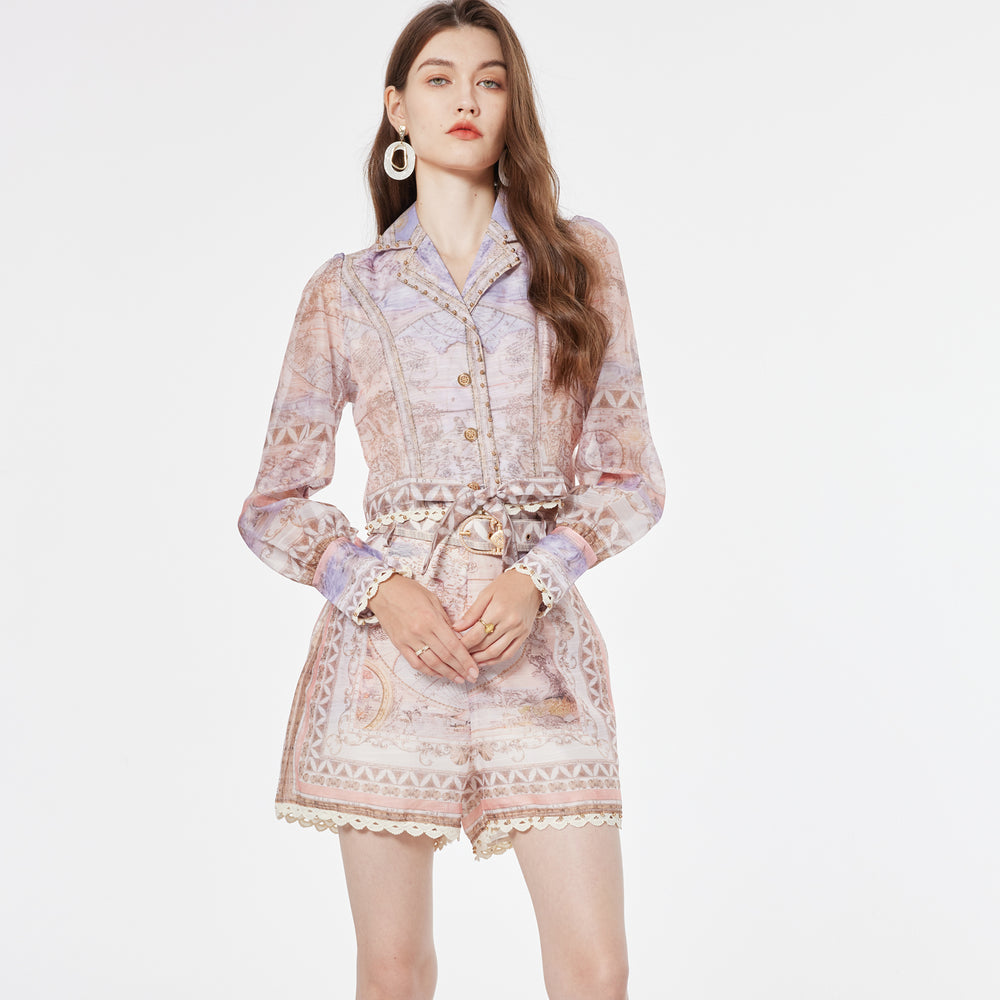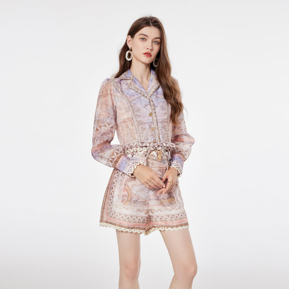 Women Spring and Autumn Printed Stitching Lace Short Top Lace Up Shirt High Waist Shorts with Belt