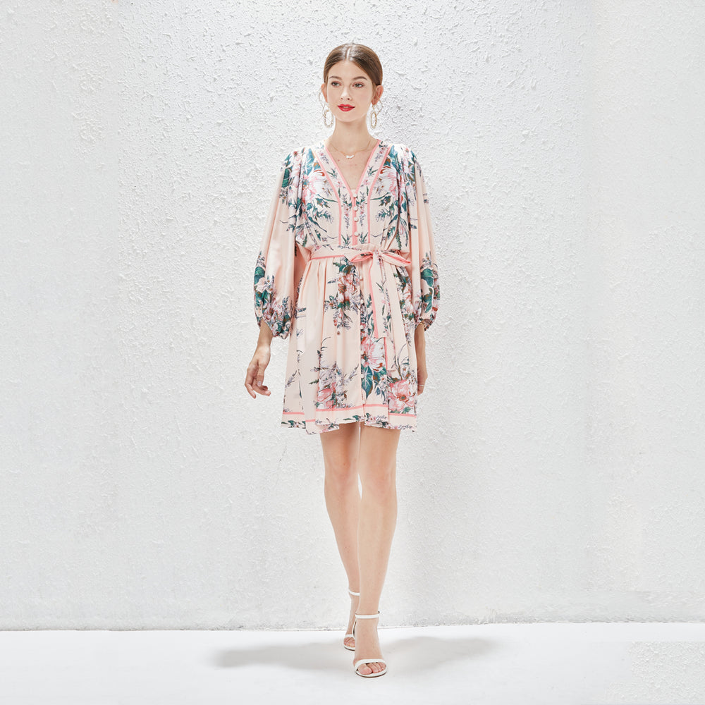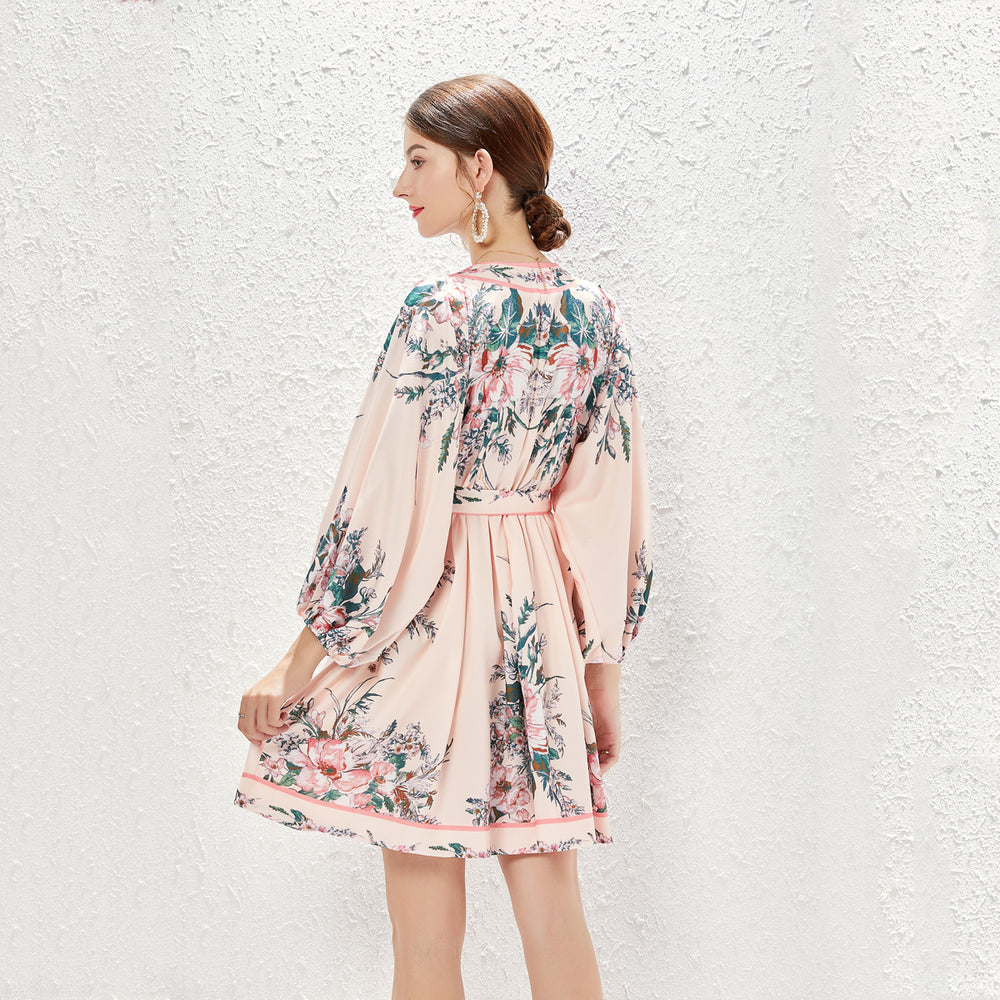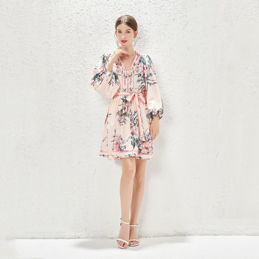 Women Spring Summer Autumn New Lantern Sleeve Single breasted V neck Dress Positioning Print Travel Dress
